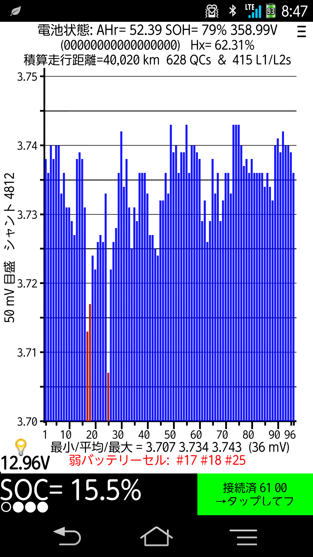 弱バッテリーセル沢山あるセルのひとつの電圧が異常に下がったときに上記のリーフスパイに表示される。